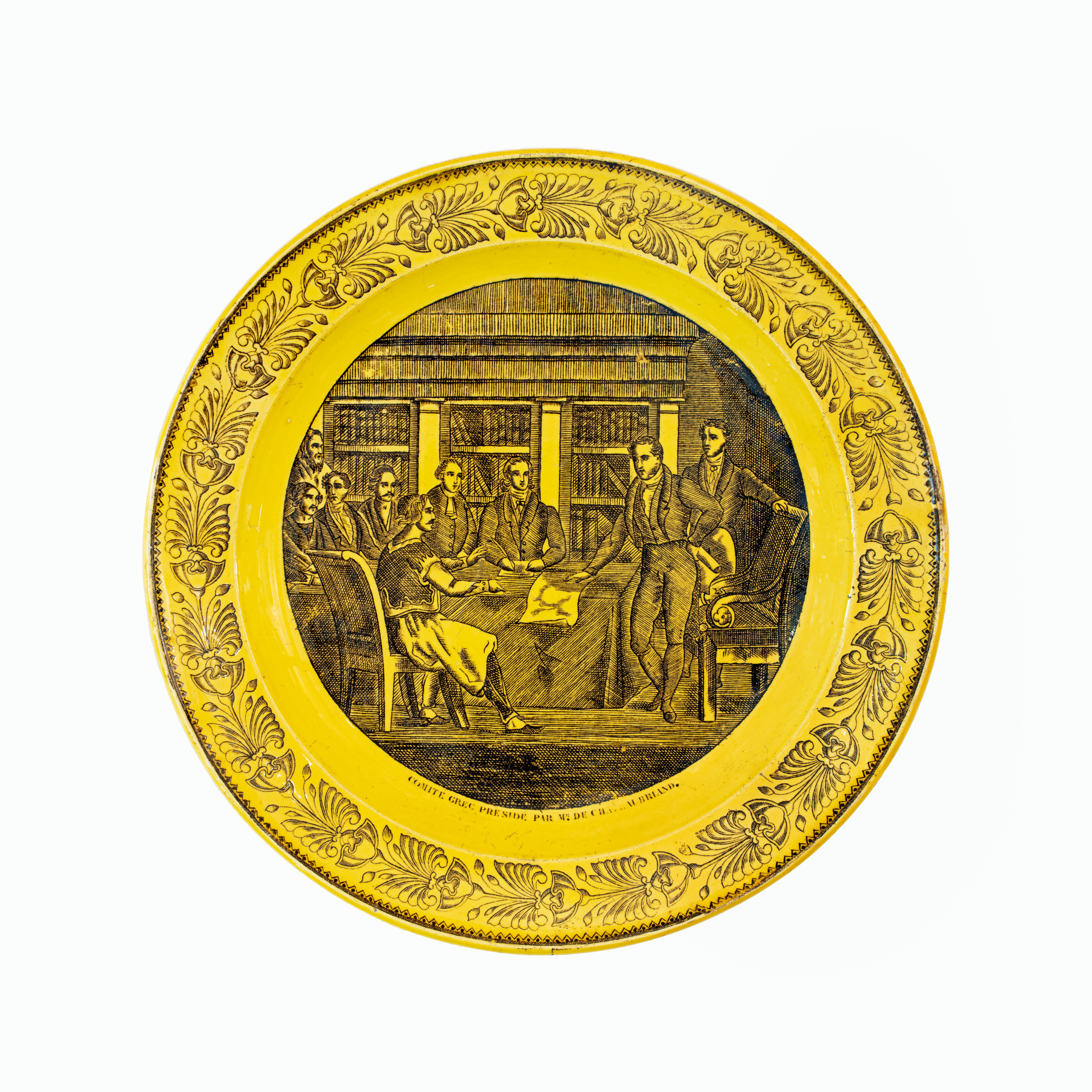 Περιγραφή: Πιάτο γαλλικό με φιλελληνική μαύρη παράσταση σε κίτρινο φόντο: Ελληνικό Κομιτάτο προεδρευόμενο από τον Σατωβριάνδο, COMITÉ GREC PRESIDÉ PAR MR CHATEAUBRIAND. Πλαίσιο από σχηματοποιημένα ανθέμια. Στην πίσω πλευρά, εμπίεστη σφραγίδα: LL&T MONTAU 11.