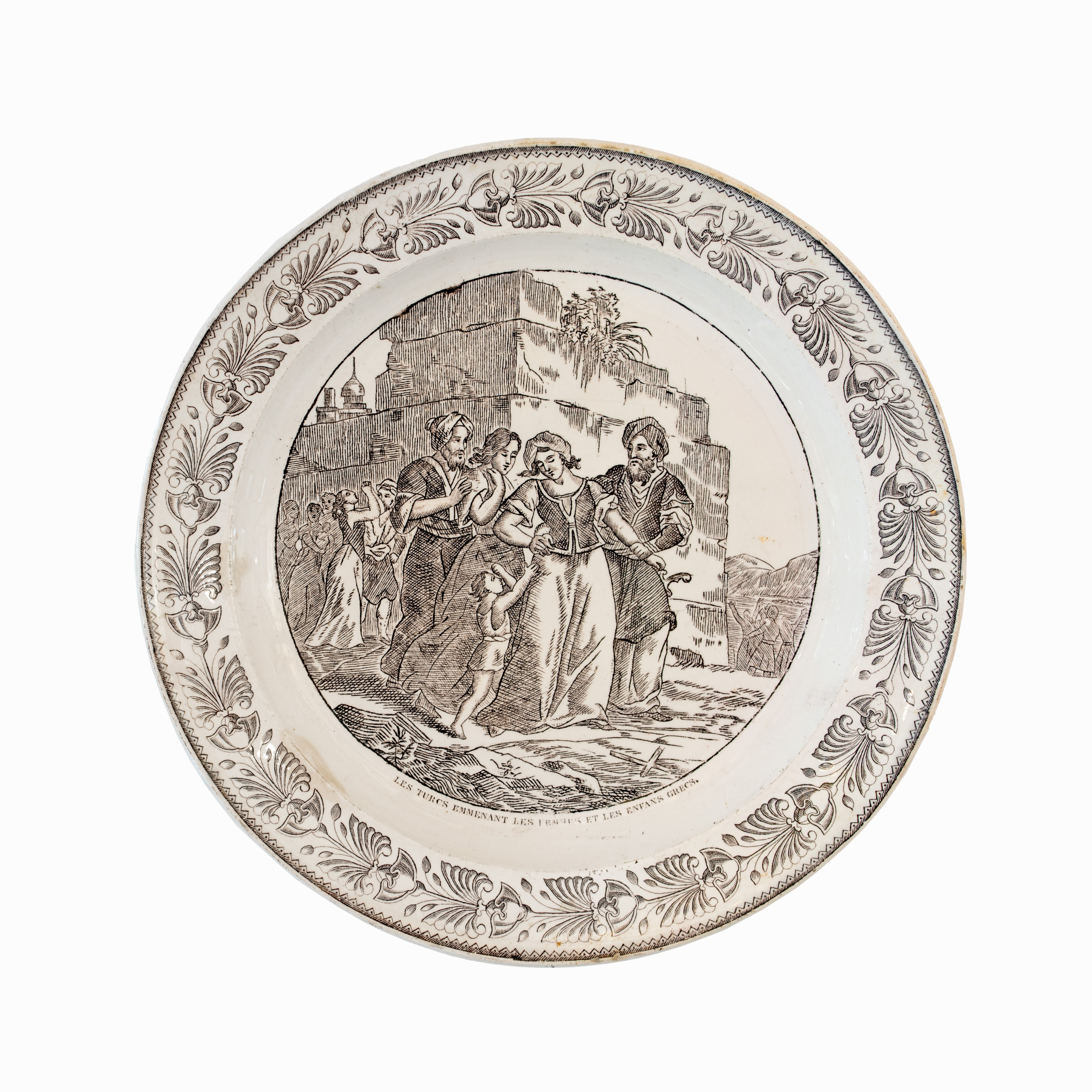 Περιγραφή: Πιάτο γαλλικό με φιλελληνική ασπρόμαυρη παράσταση: Οι Τούρκοι αρπάζουν Ελληνίδες και Ελληνόπουλα, LES TURCS EMMENANT LES FEMMES ET LES ENFANS GRECS. Πλαίσιο από σχηματοποιημένα ανθέμια. Στην πίσω πλευρά, εμπίεστη σφραγίδα: LL&T MONTAU.
