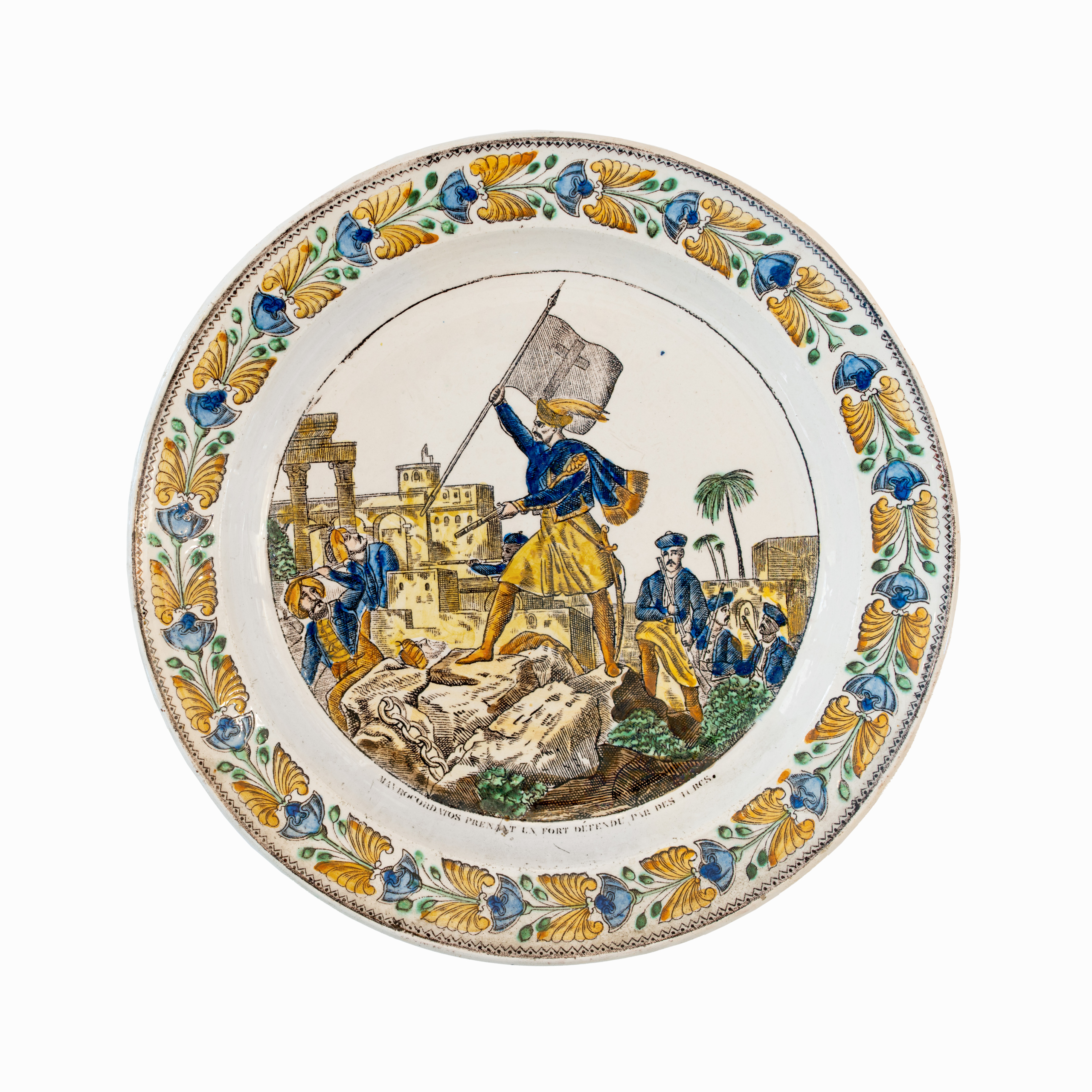 Περιγραφή: Πιάτο γαλλικό με φιλελληνική πολύχρωμη παράσταση: Άλωση τουρκικού φρουρίου από τον Μαυροκορδάτο, MAVROCORDATOS PRENANT UN FORT DEFENDU PAR DES TURCS. Πλαίσιο από σχηματοποιημένα ανθέμια. Στην πίσω πλευρά, εμπίεστη σφραγίδα: LL&T…