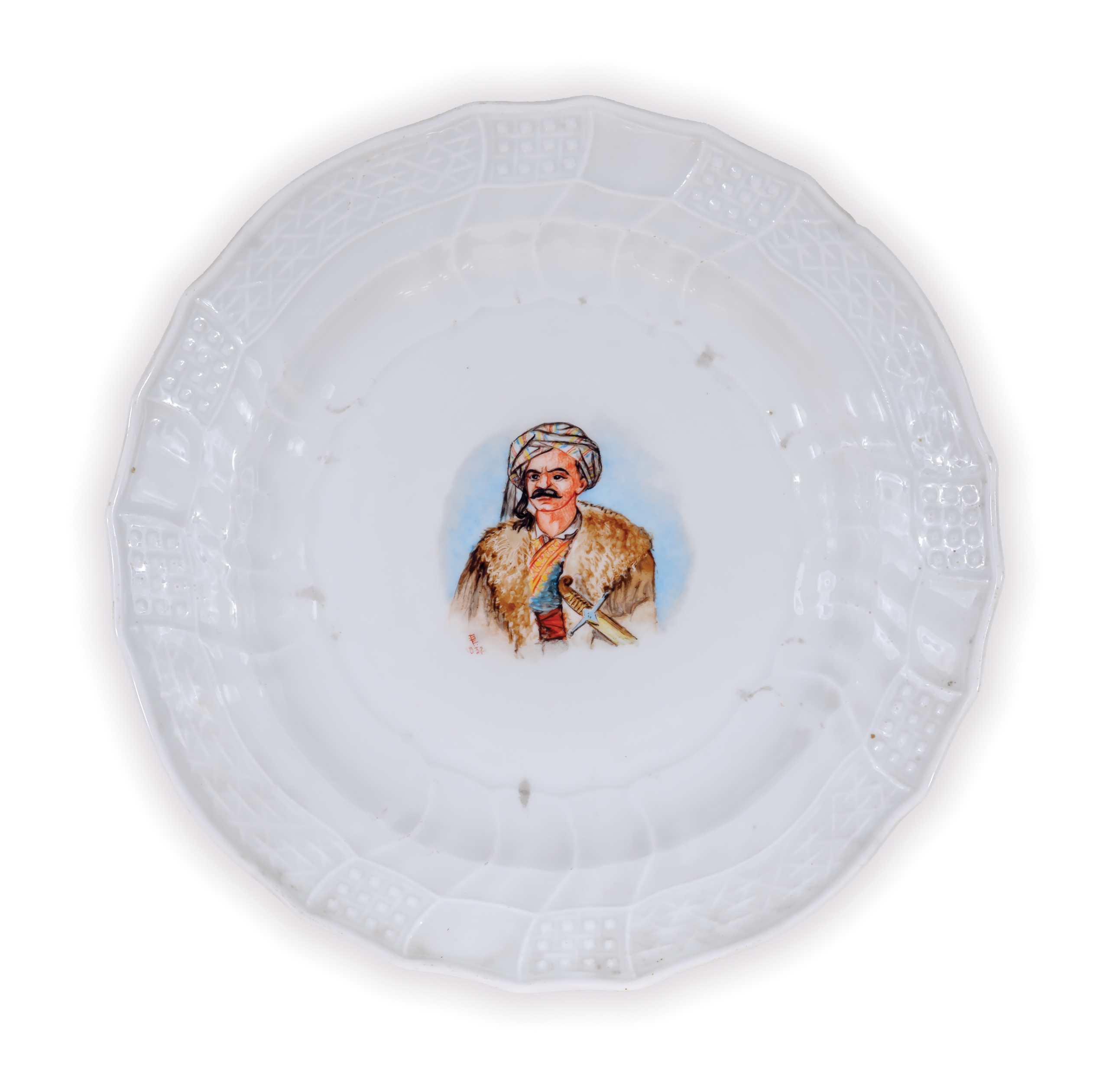 Περιγραφή: Πιάτο γερμανικό (Meissen) άσπρο με πολύχρωμη, στο κέντρο, ζωγραφισμένη στο χέρι τη μορφή του Φαβιέρου και ανάγλυφο περιχείλωμα. Στο κάτω αριστερό μέρος της ζωγραφιάς, τα αρχικά (μονογραφή) του καλλιτέχνη και 1832. Στην πίσω πλευρά, το σήμα της Meissen (δύο σπαθιά) και με το χέρι: Favier, Decorée à Bruxelles,1832 και δυσανάγνωστα αρχικά.