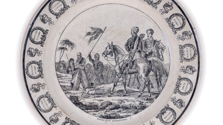 Περιγραφή: Πιάτο γερμανικό (Meissen) άσπρο με πολύχρωμη, στο κέντρο, ζωγραφισμένη στο χέρι τη μορφή του Φαβιέρου και ανάγλυφο περιχείλωμα. Στο κάτω αριστερό μέρος της ζωγραφιάς, τα αρχικά (μονογραφή) του καλλιτέχνη και 1832. Στην πίσω πλευρά, το σήμα της Meissen (δύο σπαθιά) και με το χέρι: Favier, Decorée à Bruxelles,1832 και δυσανάγνωστα αρχικά.