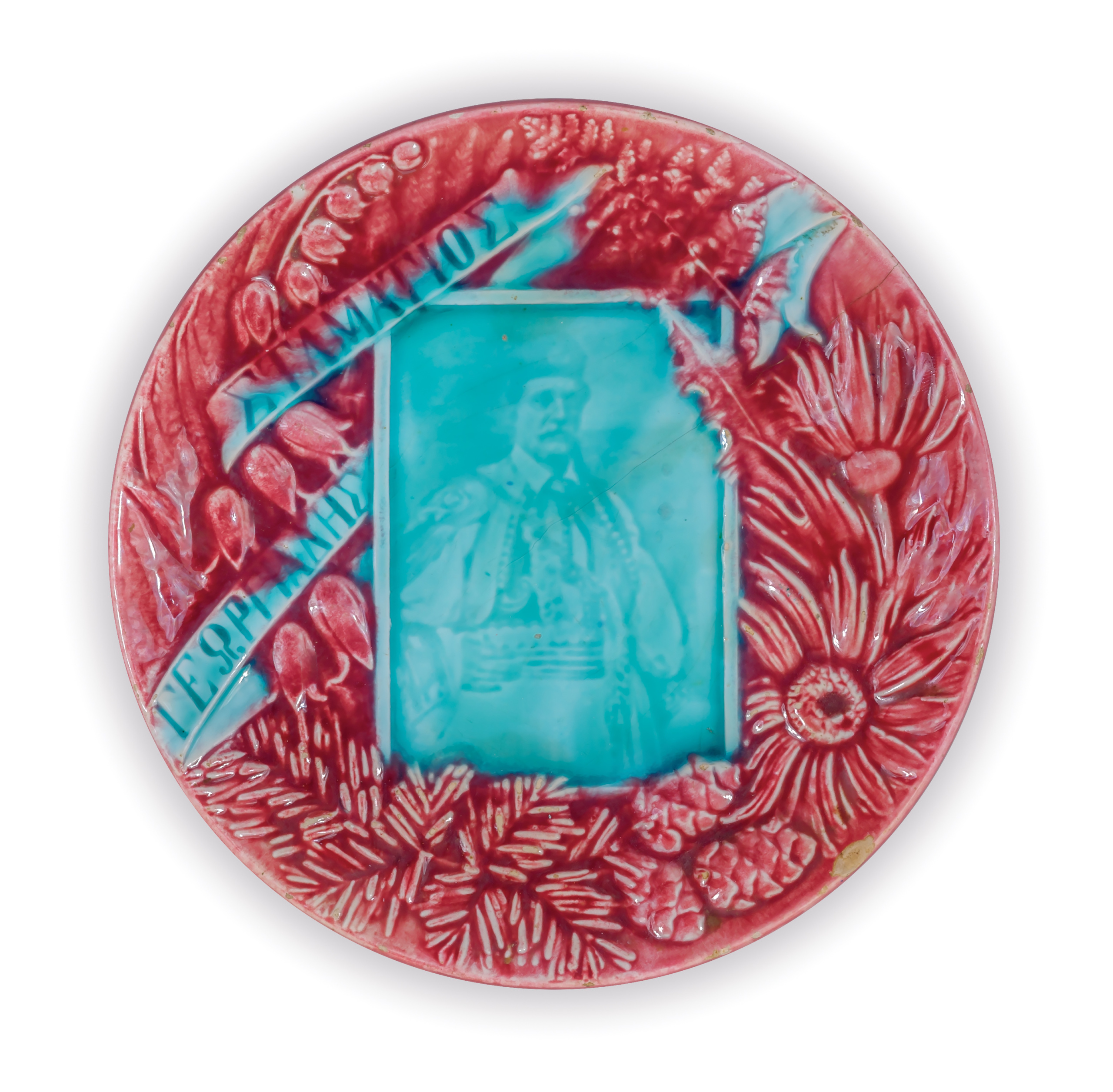 Περιγραφή: Πιάτο “Συριανό” ρηχό, με ανάγλυφο κόκκινο φυτικό διάκοσμο και, στο κέντρο, γαλαζοπράσινη φωτογραφική αποτύπωση του καπετάνιου της Σάμου Σταμάτη Γεωργιάδη, με παραδοσιακή ελληνική φορεσιά. Στην επάνω αριστερή γωνία του πορτρέτου, ταινία με το όνομα ΣΤΑΜΑΤΙΟΣ ΓΕΩΡΓΙΑΔΗΣ με το ίδιο γαλαζοπράσινο χρώμα. Στην πίσω πλευρά του πιάτου, σφραγίδα με τα στοιχεία V B S και MADE IN GERMANY.