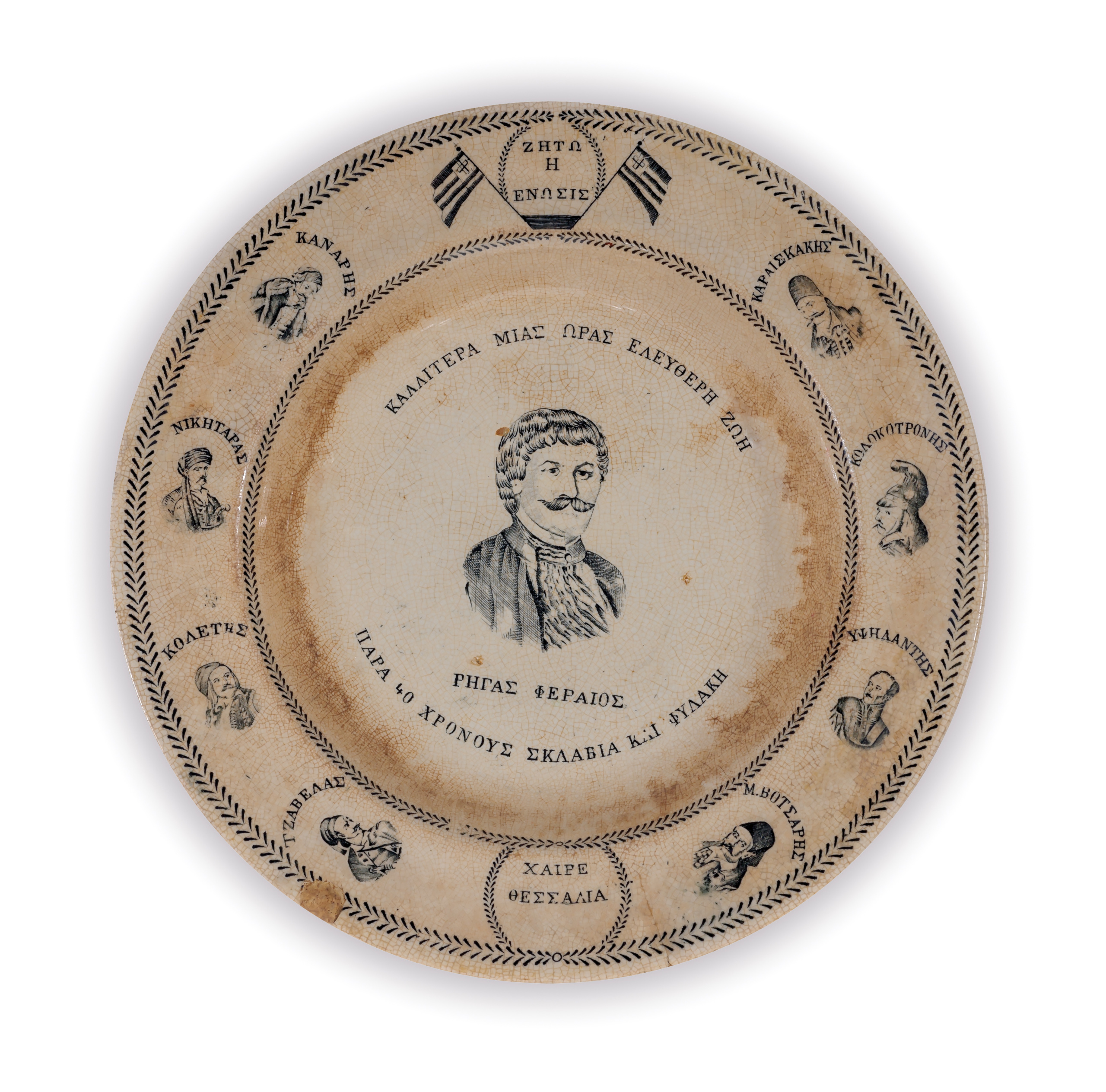 Περιγραφή: Πιάτο “Συριανό” βαθύ (μικρής διαμέτρου) με ασπρόμαυρο διάκοσμο και τη μορφή του Ρήγα Φεραίου σε προτομή (μπούστο), με την ένδειξη: ΡΗΓΑΣ ΦΕΡΑΙΟΣ. Το πιάτο είναι αναμνηστικο της ένωσης της Θεσσαλίας και της περιοχής της Άρτας με την Ελλάδα το 1881. Αναγράφονται στίχοι από τον Θούριο και στο περιχείλωμα (μπορντούρα) οι μορφές οκτώ αγωνιστών και τα ονόματά τους. Πίσω, σφραγίδα του κατασκευαστή και η σφραγίδα του παραγγέλοντος εμπόρου: ΑΦΟΙ ΚΥΡΙΑΚΟΠΟΥΛΟΙ ΒΩΛΟΣ FRATELLI CHIRIACOPULO.
