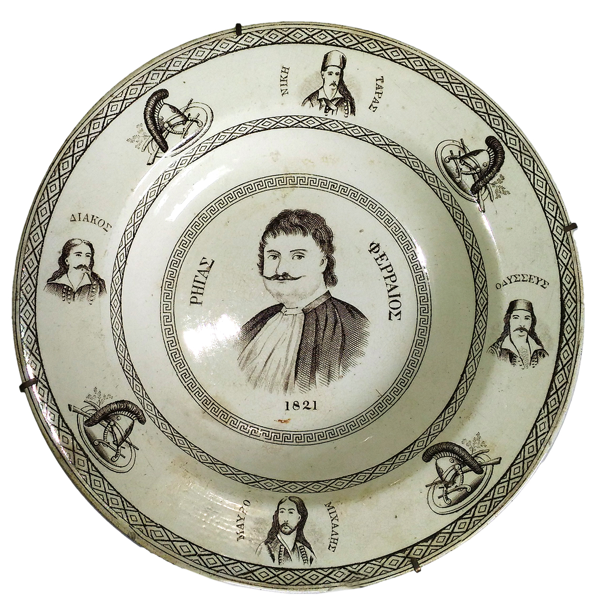 Περιγραφή: Πιάτο “Συριανό” βαθύ (μεγάλης διαμέτρου) με καφέ διάκοσμο και τη μορφή σε προτομή (μπούστο) του Ρήγα Φεραίου, με το όνομά του ΡΗΓΑΣ ΦΕΡΑΙΟΣ και από κάτω 1821. Στο περιχείλωμα (μπορντούρα), οι μορφές τεσσάρων αγωνιστών και τα ονόματά τους.