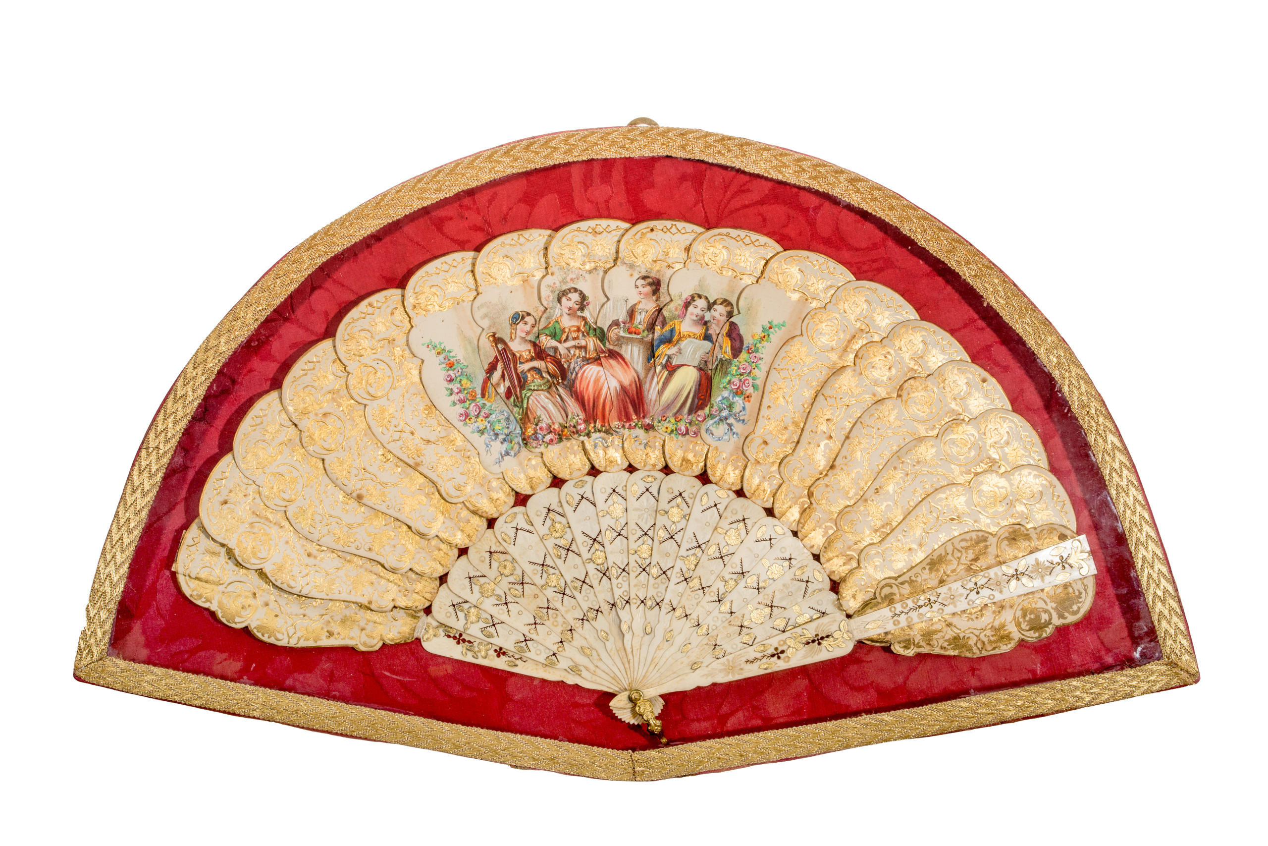 Περιγραφή: Πολύχρωμη πλούσια διακοσμημένη γαλλικής κατασκευής χάρτινη στο επάνω μέρος βεντάλια με δεκαεπτά ακτίνες από κόκκαλο και με λιθόγραφη επιχρωματισμένη με το χέρι σύνθεση από έξι γυναικείες μορφές με ελληνικές ενδυμασίες, περιτριγυρισμένες από άνθινο διάκοσμο (ρομαντική απεικόνιση). Η πίσω πλευρά έχει κολλημμένο χαρτί με στυλιζαρισμένη φυτική διακόσμηση. Η βεντάλια είναι τοποθετημένη σε ομόσχημη με τη βεντάλια κορνίζα-θήκη.