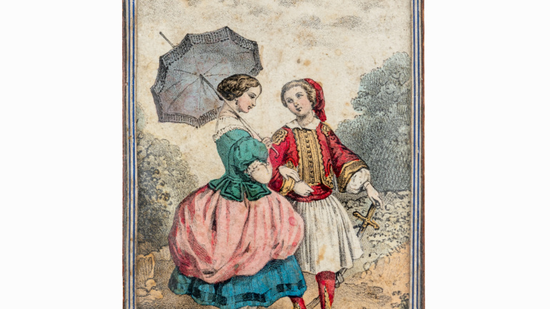 Περιγραφή: Πολύχρωμη πλούσια διακοσμημένη γαλλικής κατασκευής χάρτινη στο επάνω μέρος βεντάλια με δεκαεπτά ακτίνες από κόκκαλο και με λιθόγραφη επιχρωματισμένη με το χέρι σύνθεση από έξι γυναικείες μορφές με ελληνικές ενδυμασίες, περιτριγυρισμένες από άνθινο διάκοσμο (ρομαντική απεικόνιση). Η πίσω πλευρά έχει κολλημμένο χαρτί με στυλιζαρισμένη φυτική διακόσμηση. Η βεντάλια είναι τοποθετημένη σε ομόσχημη με τη βεντάλια κορνίζα-θήκη.