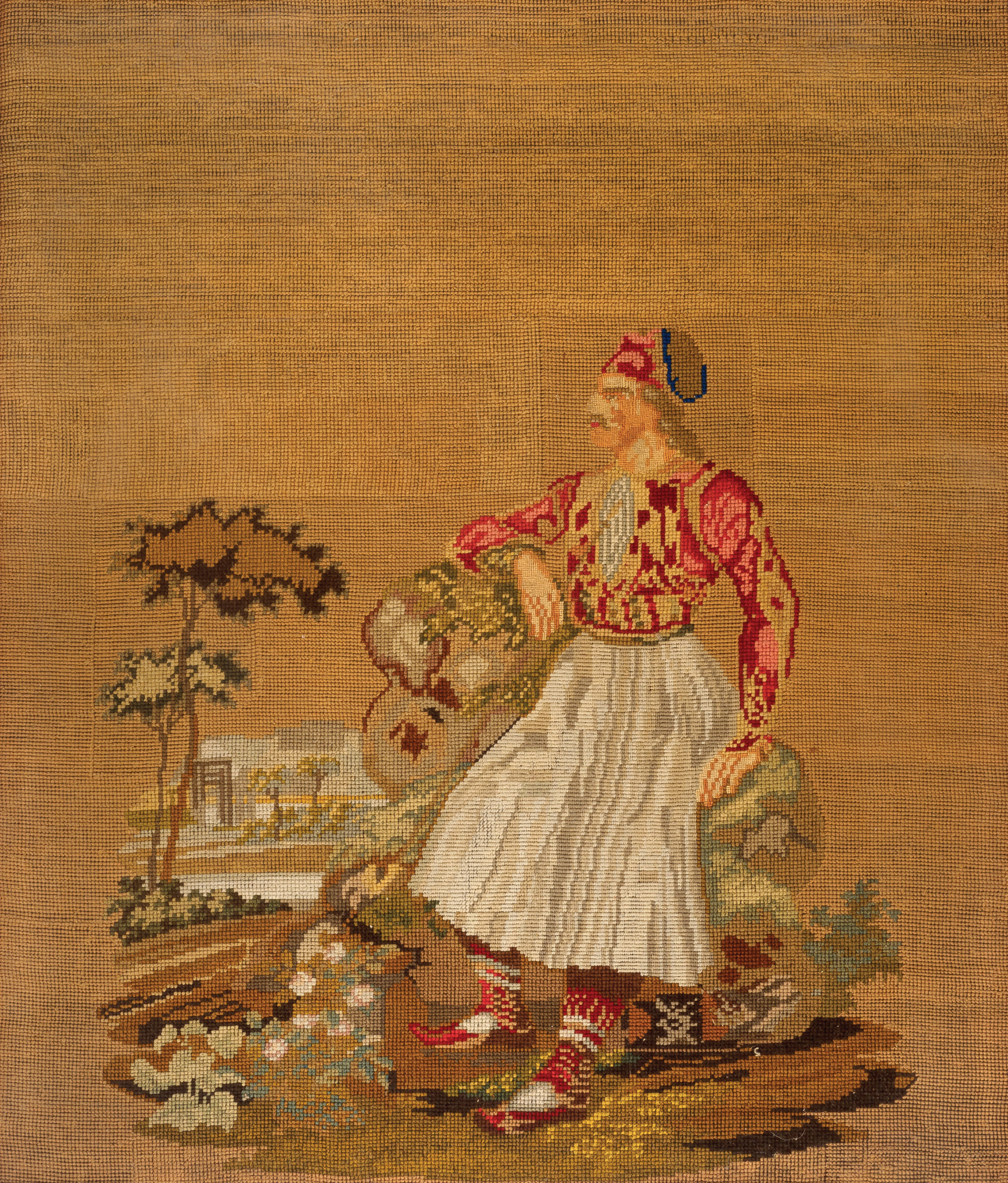 Περιγραφή: Πολύχρωμο κέντημα δυτικοευρωπαϊκής κατασκευής, με Έλληνα Αγωνιστή που μοιάζει με τον Θεόδωρο Κολοκοτρώνη. Το κέντημα είναι τεχνικής petit-point με μαλλί, εκτός από το πρόσωπο και τα άκρα των χεριών, που είναι γκομπλέν. Είναι τοποθετημένο μέσα σε προστατευτικό τζακιού από ξύλο, ανακλινόμενο, με πλεξιγκλάς και στις δύο όψεις. Στην πίσω όψη, κέντημα με μαχόμενους Τούρκους ιππείς.