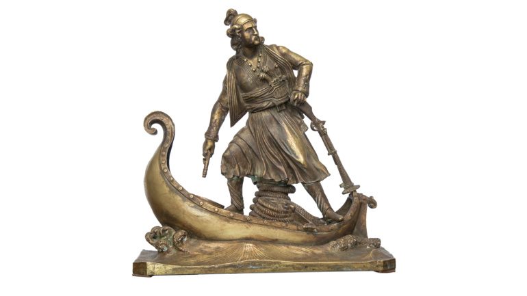 Περιγραφή: Πολύχρωμο κέντημα δυτικοευρωπαϊκής κατασκευής, με Έλληνα Αγωνιστή που μοιάζει με τον Θεόδωρο Κολοκοτρώνη. Το κέντημα είναι τεχνικής petit-point με μαλλί, εκτός από το πρόσωπο και τα άκρα των χεριών, που είναι γκομπλέν. Είναι τοποθετημένο μέσα σε προστατευτικό τζακιού από ξύλο, ανακλινόμενο, με πλεξιγκλάς και στις δύο όψεις. Στην πίσω όψη, κέντημα με μαχόμενους Τούρκους ιππείς.