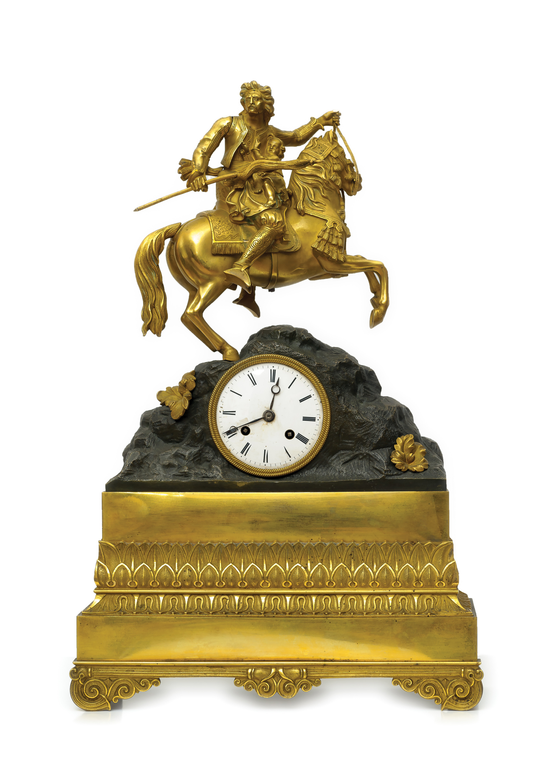 Περιγραφή: Ρολόι επιτραπέζιο γαλλικής κατασκευής, από επιχρυσωμένο μπρούντζο, με Έλληνα έφιππο αγωνιστή και μικρό παιδί. Στο λεύκωμα ΟΙ ΩΡΕΣ ΤΟΥ ΑΓΩΝΑ (S. Adler) το ρολόι έχει τίτλο: Ο Πολεμιστής υπερασπίζεται το παιδί του.