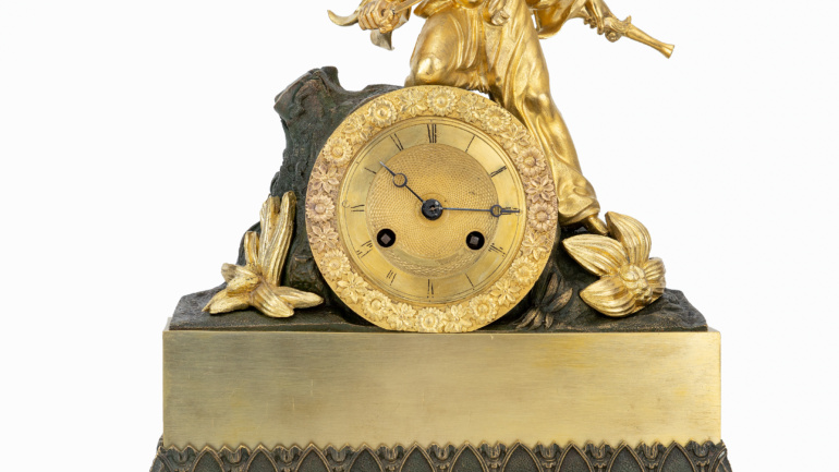 Περιγραφή: Ρολόι επιτραπέζιο γαλλικής κατασκευής, από επιχρυσωμένο μπρούντζο, με Έλληνα έφιππο αγωνιστή και μικρό παιδί. Στο λεύκωμα ΟΙ ΩΡΕΣ ΤΟΥ ΑΓΩΝΑ (S. Adler) το ρολόι έχει τίτλο: Ο Πολεμιστής υπερασπίζεται το παιδί του.
