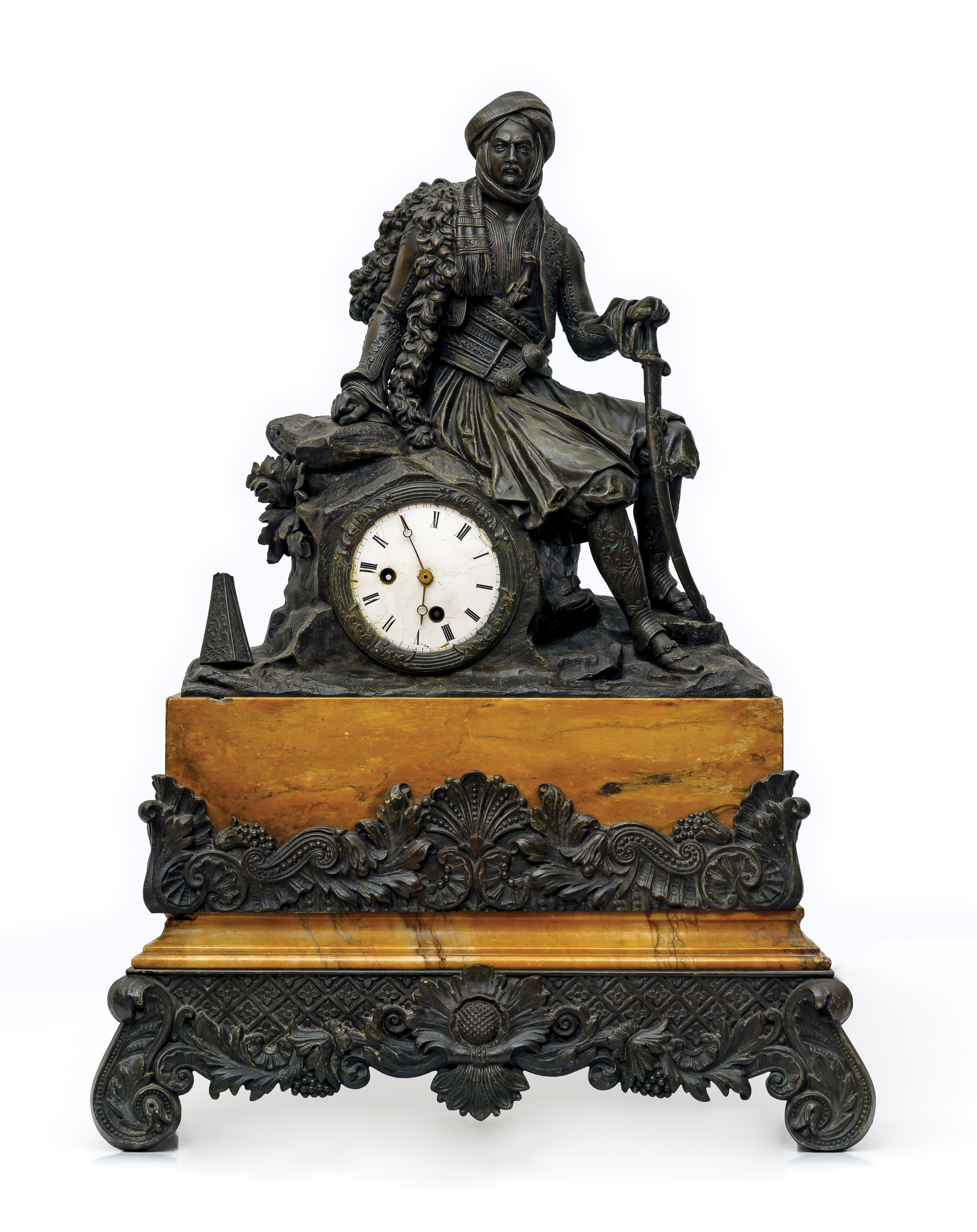 Περιγραφή: Ρολόι επιτραπέζιο γαλλικής κατασκευής, από πατιναρισμένο σκουρόχρωμο αντιμόνιο και ανοιχτόχρωμο (υποκίτρινο) μάρμαρο (βάση, μάρμαρο Σιέννας;) με Έλληνα αγωνιστή (Ηπειρώτης / Σουλιώτης). Δεξιά του αγωνιστή υπάρχει το κάτω μέρος από ευρύκαννο όπλο. Λείπει το μεγαλύτερο μέρος.
