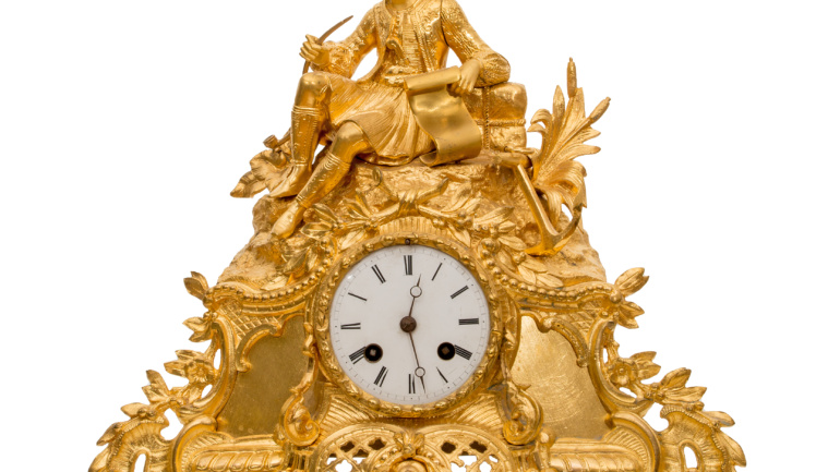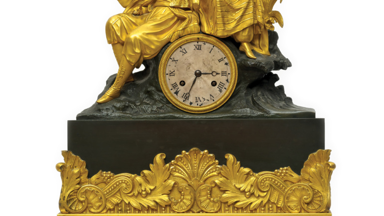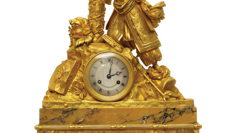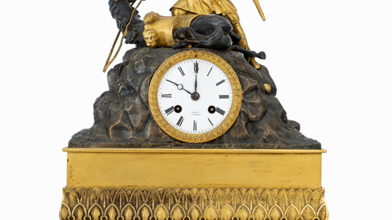 Περιγραφή: Ρολόι επιτραπέζιο γαλλικής κατασκευής, από πατιναρισμένο σκουρόχρωμο αντιμόνιο και ανοιχτόχρωμο (υποκίτρινο) μάρμαρο (βάση, μάρμαρο Σιέννας;) με Έλληνα αγωνιστή (Ηπειρώτης / Σουλιώτης). Δεξιά του αγωνιστή υπάρχει το κάτω μέρος από ευρύκαννο όπλο. Λείπει το μεγαλύτερο μέρος.