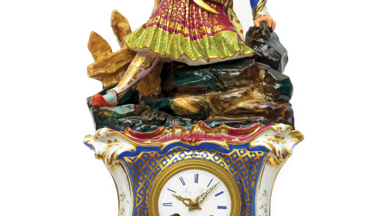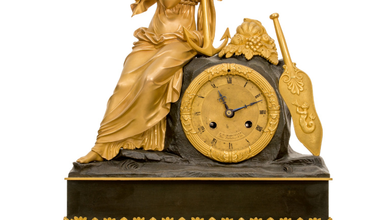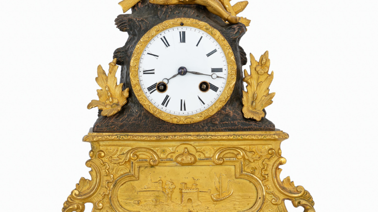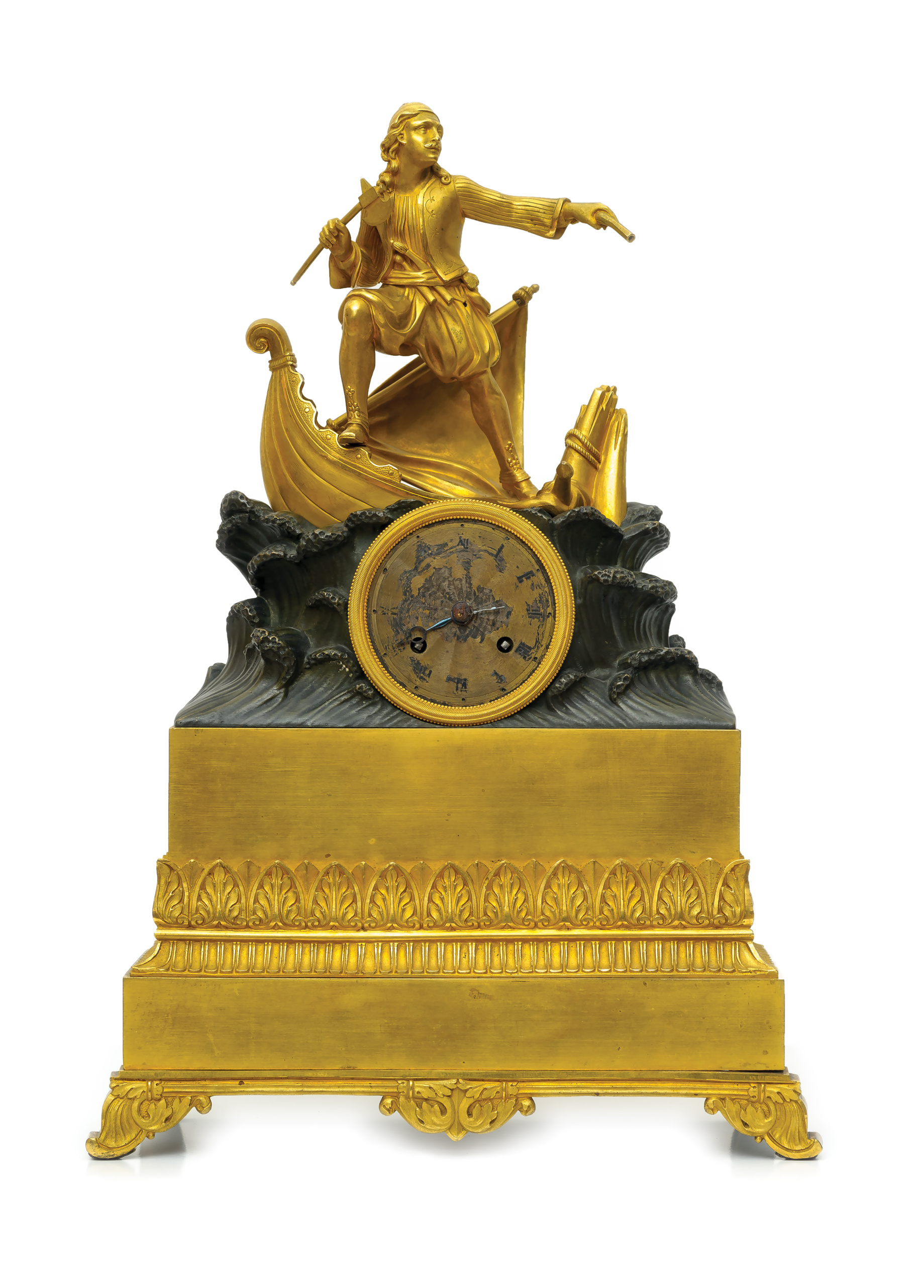 Περιγραφή: Ρολόι επιτραπέζιο γαλλικής κατασκευής, σε συνδυασμό επιχρυσωμένου και πατιναρισμένου σκουρόχρωμου  μπρούντζου, με Έλληνα ναυτικό (Κ. Κανάρης) σε επίθεση επάνω σε βάρκα με πανί (σκαμπαβία [βάρκα διαφυγής μετά την πυρπόληση]).