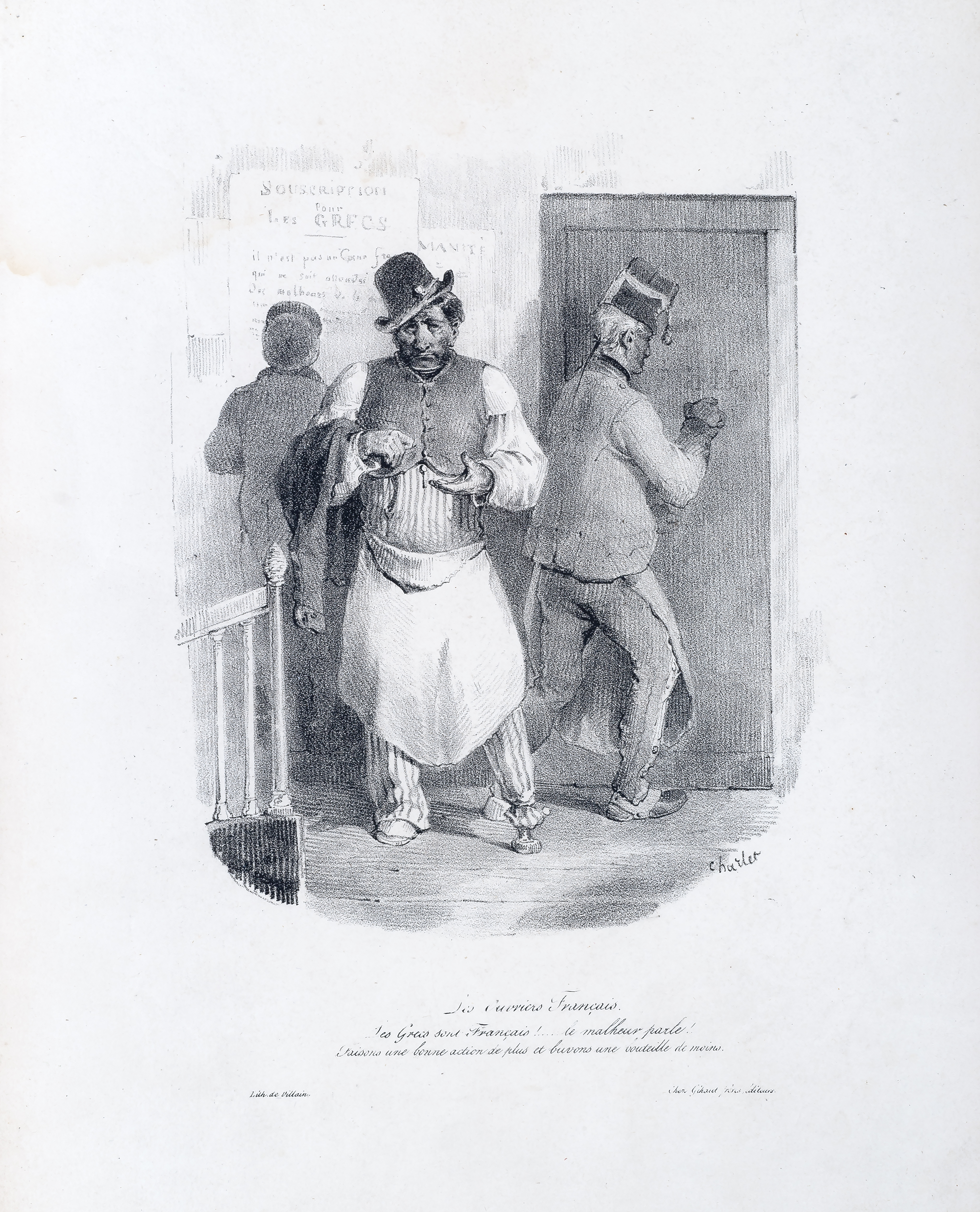 Περιγραφή: Λιθογραφία ασπρόμαυρη με τίτλο: SOUSCRIPTION POUR LES GRECS (ακολουθεί δυσανάγνωστο κείμενο). Κάτω δεξιά στην εικόνα, υπογραφή: Charler. Στο κάτω μέρος: Les ouvriers Francais. Les Grecs sont Francais!… le malheur parle! Faisons une bonne action de plus et buvons une bouteille de moins. (Οι Γάλλοι εργάτες. Οι Έλληνες είναι Γάλλοι!..η δυστυχία μιλά.! Ας κάνουμε μια επιπλέον καλή πράξη, ας πιούμε ένα μπουκάλι λιγότερο). Κάτω αριστερά: Lith. de Villain και δεξιά: Chez Gihaut Frères Éditeurs.