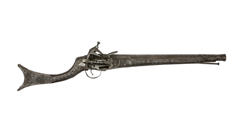C0792-IΕνότητα: ΟΠΛΑ ΤΗΣ ΕΠΟΧΗΣ ΤΟΥ ΑΓΩΝΑΚωδικός: C0792 (C0792-I, C0792-II, C0792-III & C0792-IV)Υλικό: ΧΑΛΥΒΑΣ, ΞΥΛΟ, ΑΣΗΜΙΧρονολογία κατασκευής: Αρχές 19ου αιώναΔιαστάσεις: Μήκος 51,5 εκ.Περιγραφή: Ασημένια οθωμανική πιστόλα, γιαννιώτικης διακόσμησης. Έχει έντονα έξεργο καλεμιστό διάκοσμο από σχηματοποιημένα φυτικά μοτίβα στο ογκώδες…
