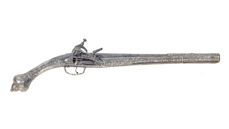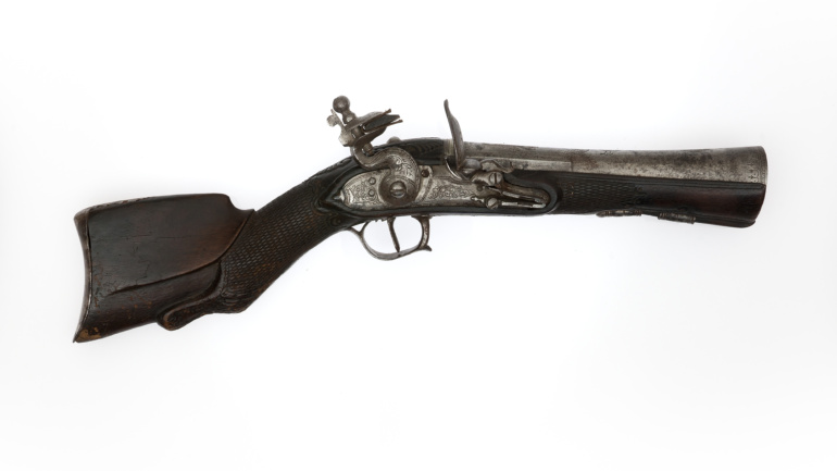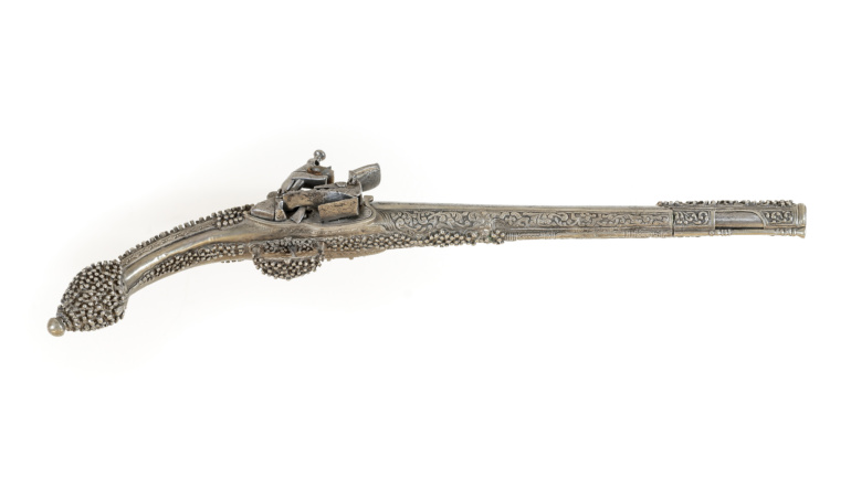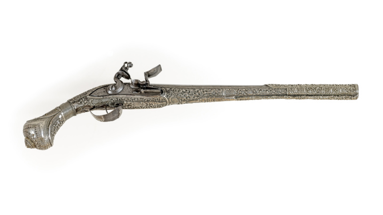 C0319-IΕνότητα: ΟΠΛΑ ΤΗΣ ΕΠΟΧΗΣ ΤΟΥ ΑΓΩΝΑΚωδικός: C0319-I & C0319-IIΧρονολογία κατασκευής: Αρχές 19ου αιώναΥλικό: ΧΑΛΥΒΑΣ, ΑΣΗΜΙΔιαστάσεις: Μήκος 56,5 εκ.Περιγραφή: Ασημένια (χαμηλόβαθμο ασήμι) επιμήκης ελληνική πιστόλα, που το πίσω της μέρος έχει το σχήμα του ελληνικού καριοφιλιού (ψαράκι).΄Εχει πυκνοδουλεμένο καλεμιστό…