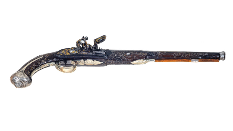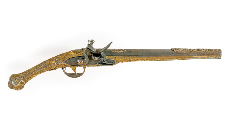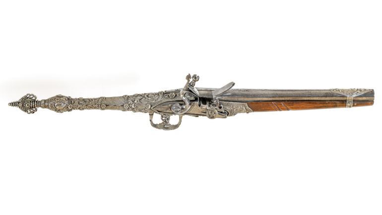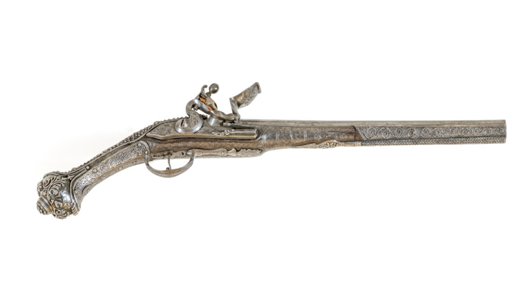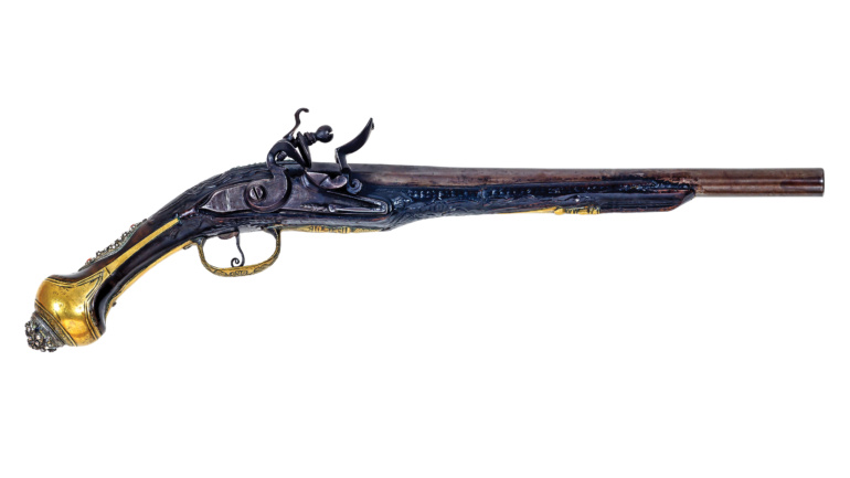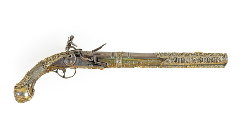 C0749-IΕνότητα: ΟΠΛΑ ΤΗΣ ΕΠΟΧΗΣ ΤΟΥ ΑΓΩΝΑΚωδικός: C0749 (C0749-I & C0749-II)Υλικό: ΧΑΛΥΒΑΣ, ΑΣΗΜΙΧρονολογία κατασκευής: Τέλη 18ου - αρχές 19ου αιώναΔιαστάσεις: Μήκος 50 εκ.Περιγραφή: Ασημένια επίχρυση Ελληνική πιστόλα. Έχει πλούσιο, έξεργο, καλεμιστό διάκοσμο από πολεμικά σύμβολα, άνθη, πουλιά, αχιβάδες και…