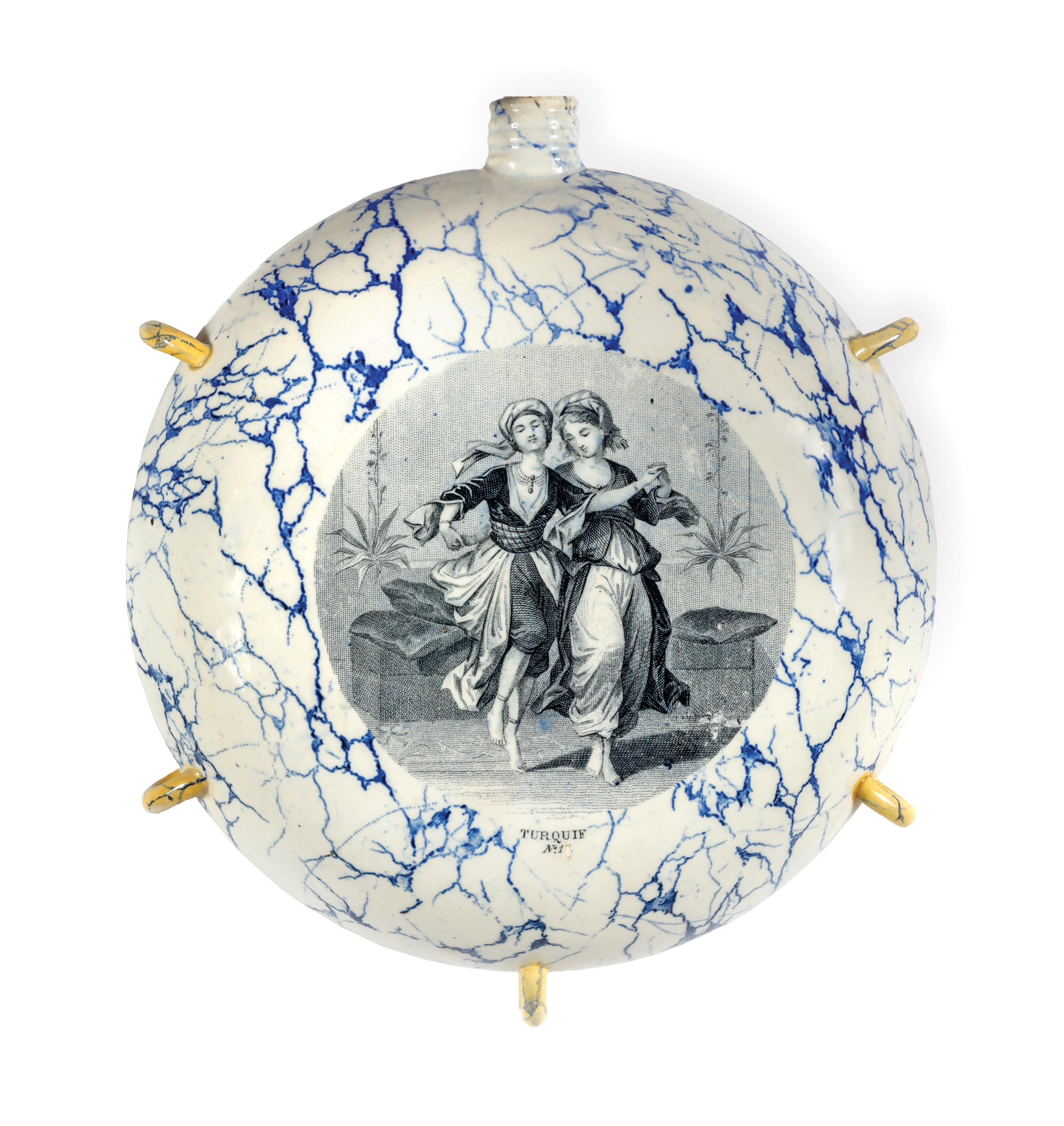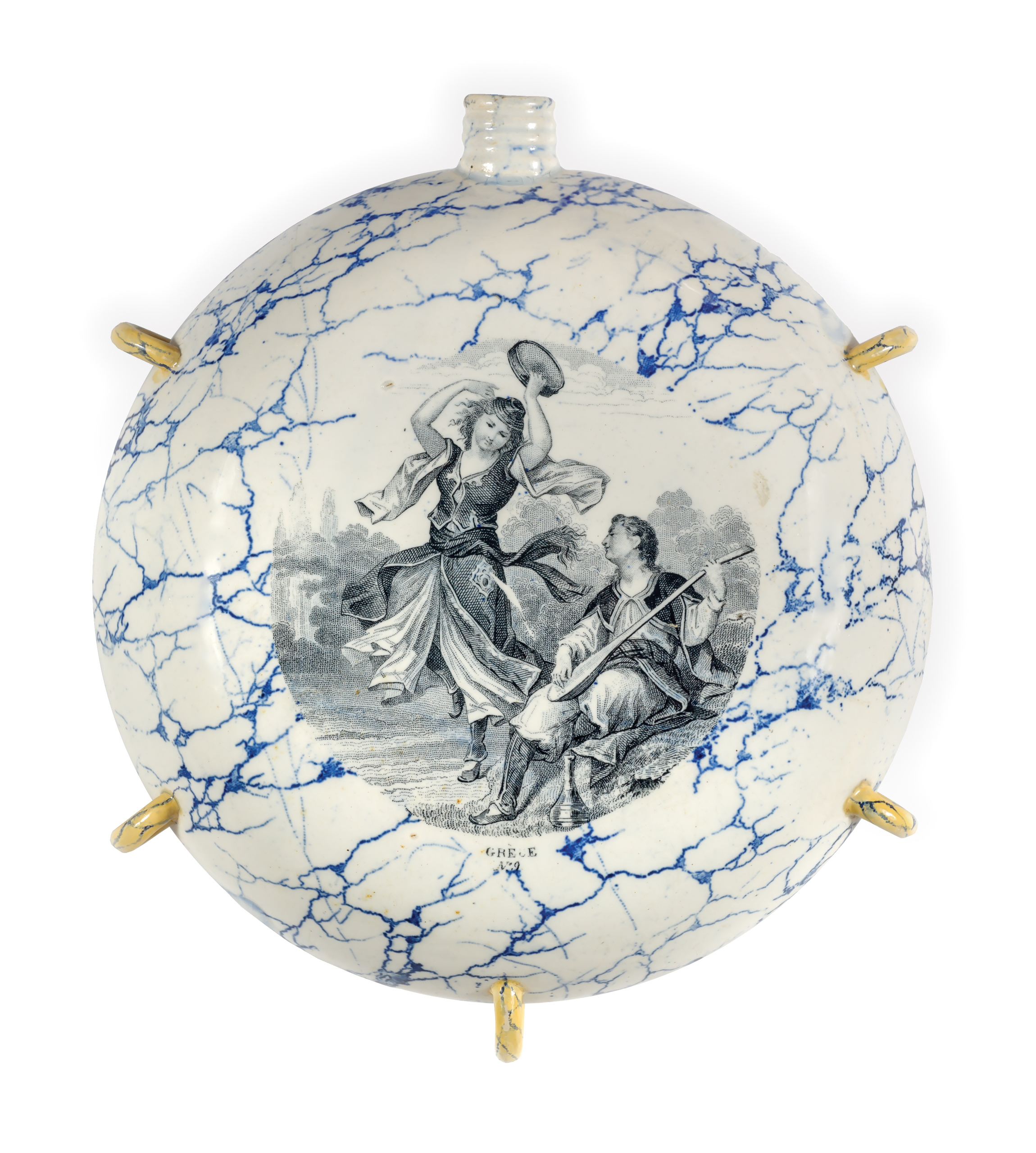 Περιγραφή: Φλασκί γαλλικό με βαθυγάλαζες γραμμές σε φόντο λευκό σε όλη την επιφάνειά του και παραστάσεις στις δύο όψεις. Στη μία νεαρή Ελληνίδα χορεύει κρατώντας ντέφι και καθισμένος νεαρός Έλληνας που παίζει έγχορδο όργανο. Κάτω, η επιγραφή: GRÉCE No.9. Στην άλλη όψη, δύο νεαρές Τουρκάλες χορεύουν. Κάτω, η επιγραφή: TURQUIE No.10. Στην περιφέρεια έχει πέντε υποδοχές, πιθανώς για πέρασμα κορδονιού ανάρτησης.