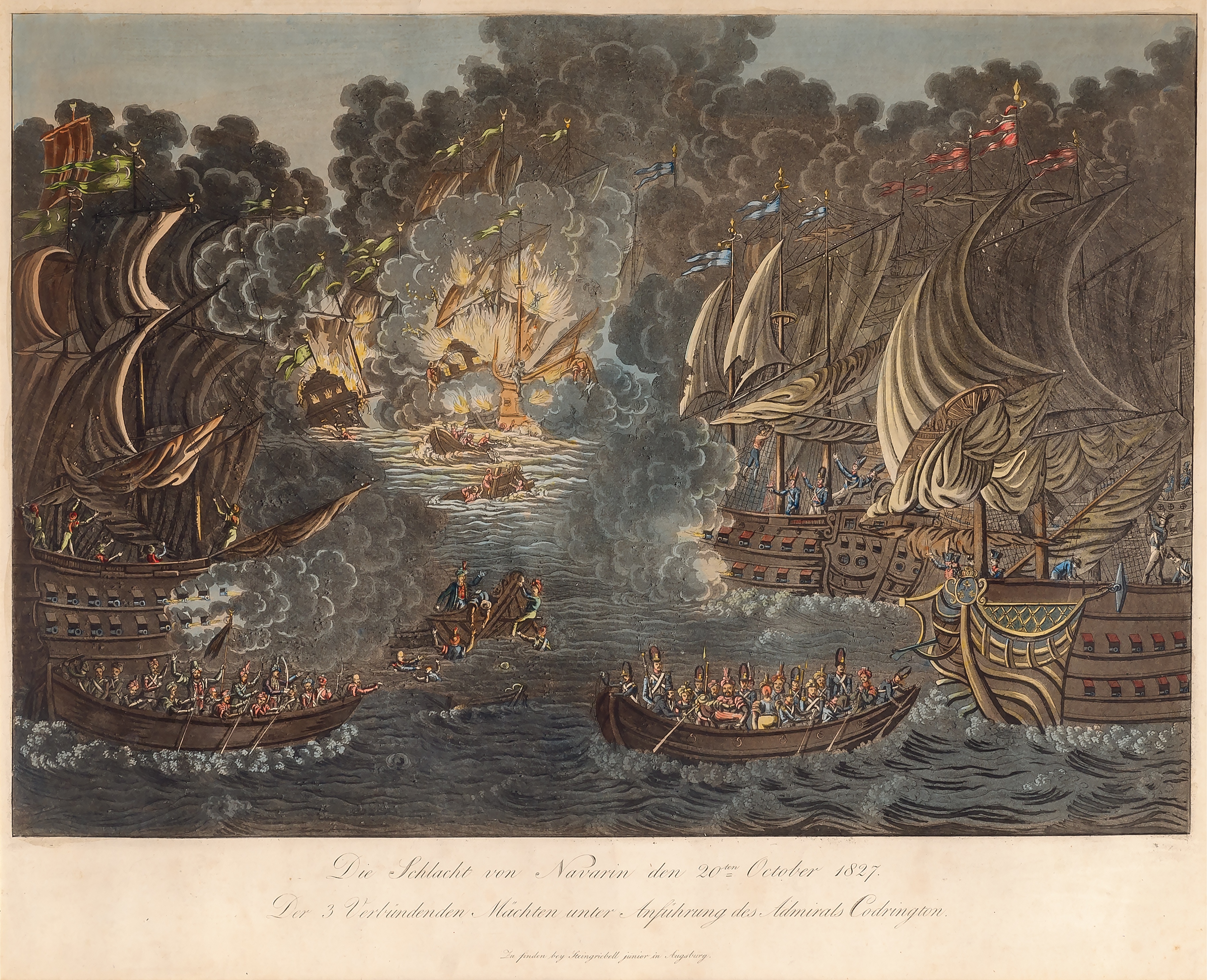 Περιγραφή: Λιθογραφία γερμανική, επιζωγραφισμένη με το χέρι και τίτλο: Die Schlacht von Navarin den 20ten October 1827. Der 3 Verbuendenden Maechten unter Anfuehrung des Admirals Codrington. (H ναυμαχία του Ναυαρίνου στις 20 Οκτωβρίου 1827. Οι 3 ενωμένες δυνάμεις υπό την ηγεσία του ναυάρχου Κόδριγκτον). Εικάζεται ότι είναι έργο λαϊκού ζωγράφου της εποχής, λόγω των λαϊκών στοιχείων που κυριαρχούν στη σύνθεση. Κάτω από τον τίτλο: Zu finden bey Steingriebell junior in Augsburg.